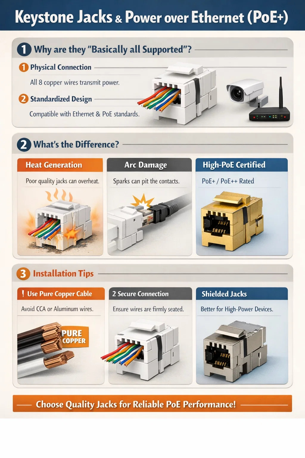 Você pode pensar em um Keystone Jack como um “cabo de extensão”; contanto que esteja conectado usando a configuração padrão de 8 fios, a corrente pode fluir através dele. No entanto, ao lidar com dispositivos de maior potência, há alguns detalhes a considerar: