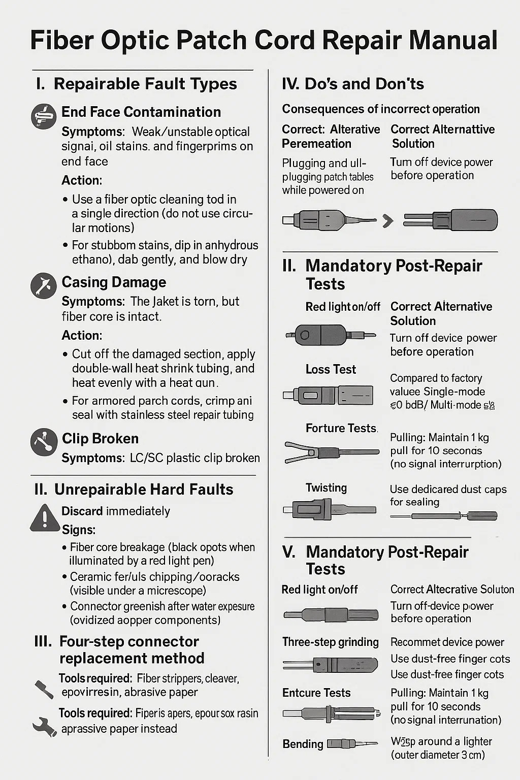 Remoção da ponta da fibra: Corte a ponta danificada, deixando pelo menos 15cm de excesso de fibra. Retire 3 cm da capa externa e limpe o núcleo da fibra com um pano com álcool. Rosqueie um novo conector. Insira a fibra nua em uma nova luva cerâmica LC/SC. Injetar resina epóxi azul e curar por 30 minutos. Corte de precisão: Use um cortador de fibra para remover verticalmente o excesso de núcleo de fibra. A seção transversal deve sobressair ≤0,5 mm da luva. Polimento final da face