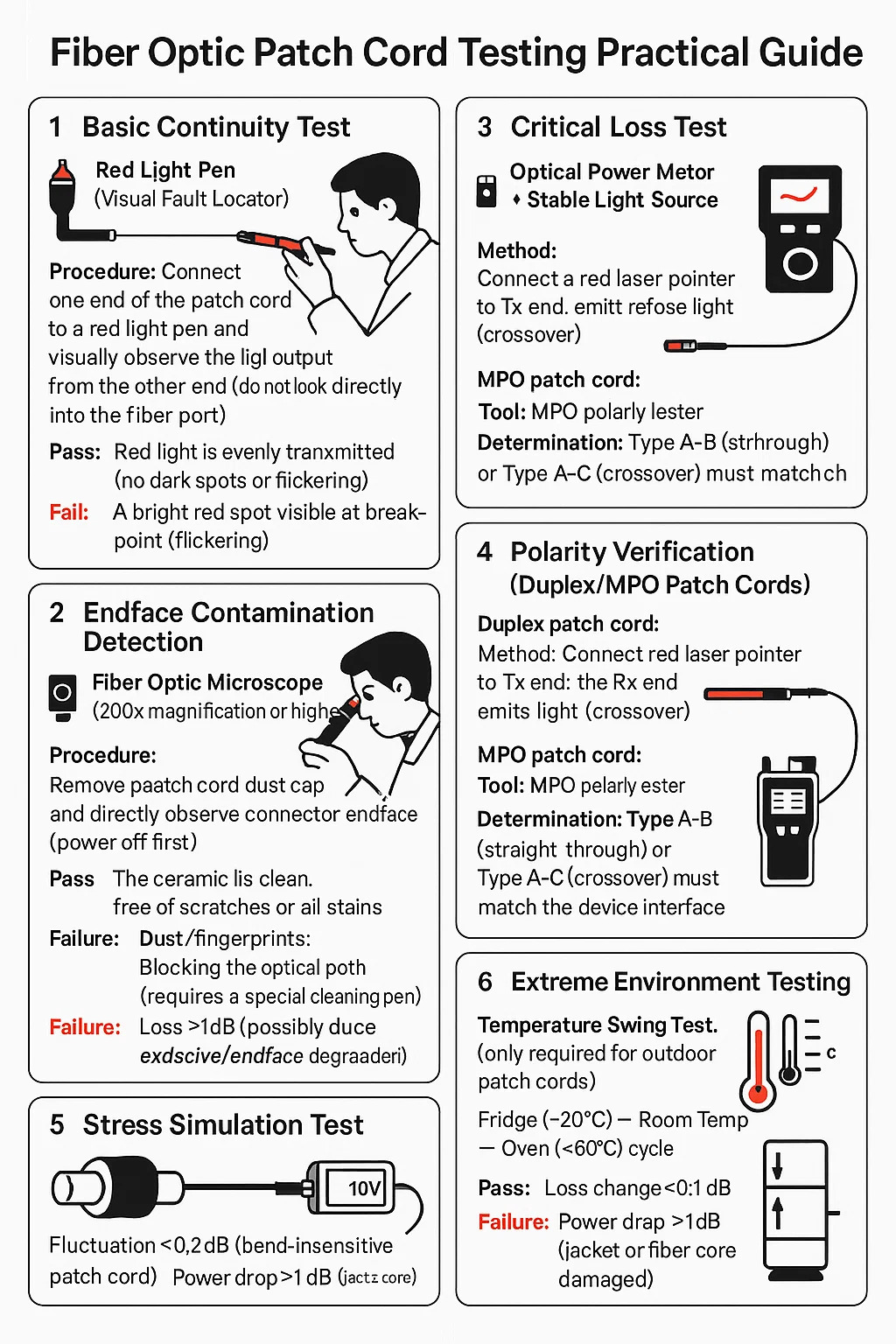 Passar: Fluctuation ≤0.2dB (bend-insensitive patch cord). Failure: Power drop > 1dB (jacket or fiber core damaged).