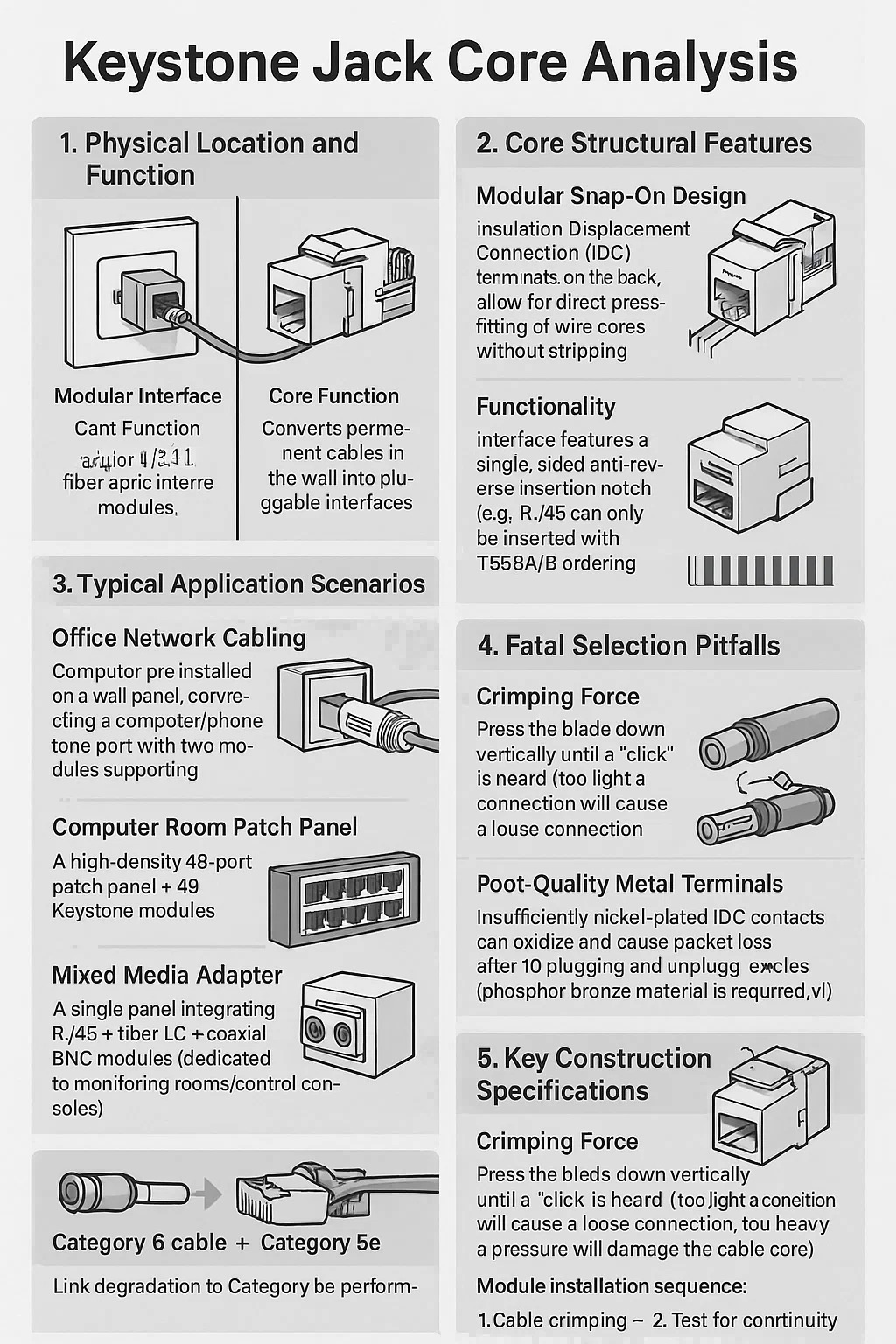 Cabeamento de Rede Escritório: Keystone pré-instalado em painel de parede, conectando um computador/telefone (uma porta com dois módulos suportando dados e voz). Patch Panel para Sala de Computadores: Um patch panel de alta densidade com 48 portas = 48 módulos Keystone (mais fácil de manter do que um modelo multifuncional).