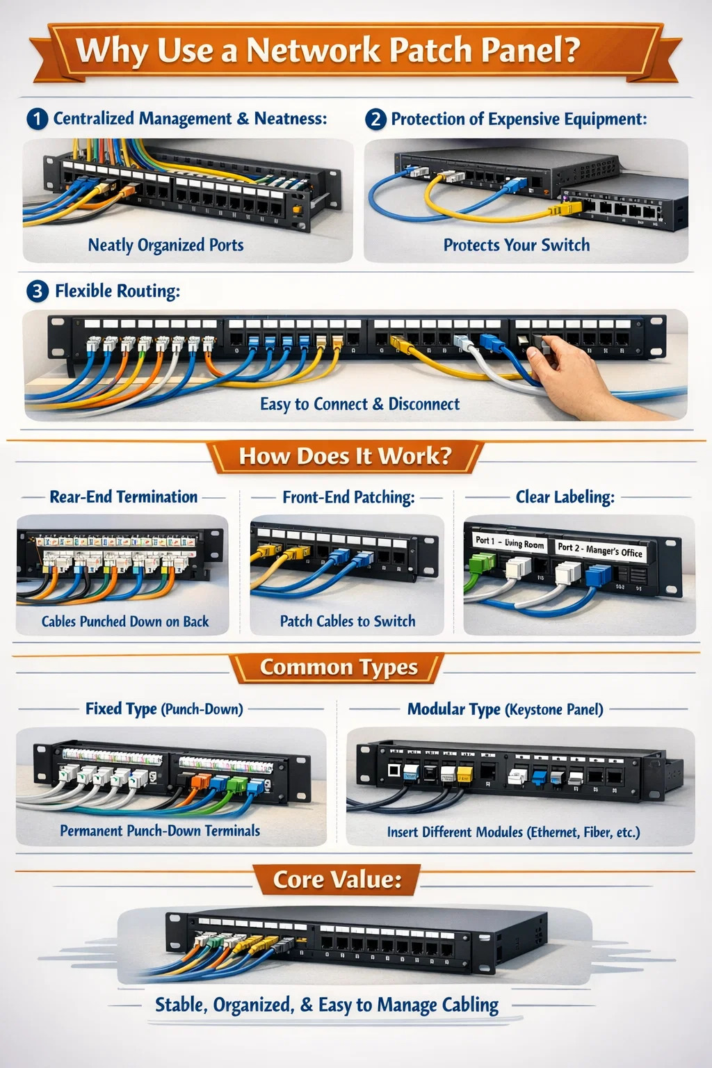 O objetivo de um patch panel de rede não é tornar a rede mais rápida, mas torná-la mais estável, esteticamente agradável e mais fácil de manter. É a linha divisória entre cabeamento profissional e cabeamento confuso.